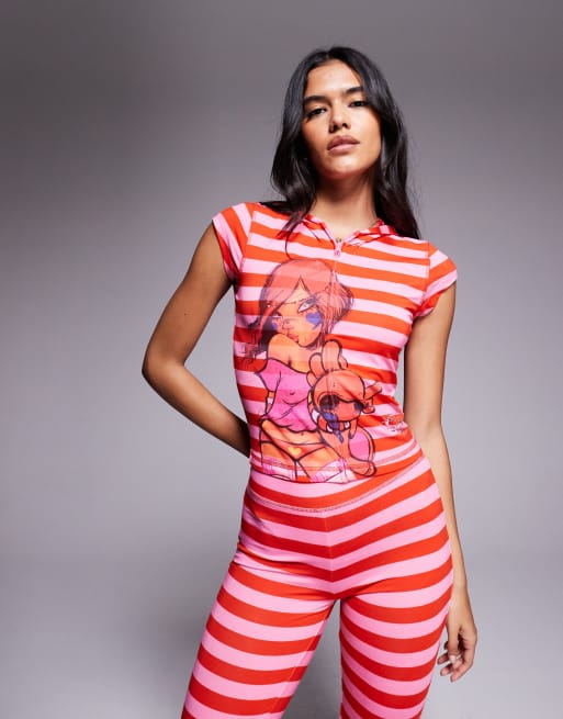 I.AM.GIA x Fafi Blare - Fafinettes - Felpa con cappuccio a righe rosa e rosse con zip, grafica e maniche ad aletta in coordinato