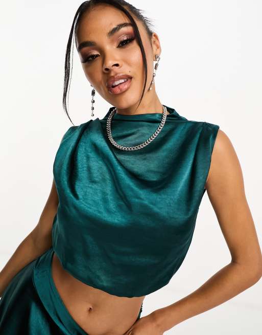 Esclusiva In The Style - Top senza maniche accollato in raso verde-azzurro in coordinato