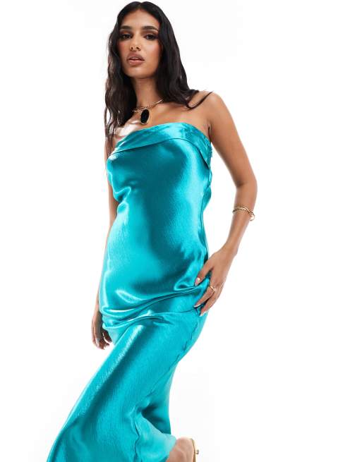 Esclusiva In The Style - Vestito lungo a fascia in raso liquido turchese con cut-out sul retro