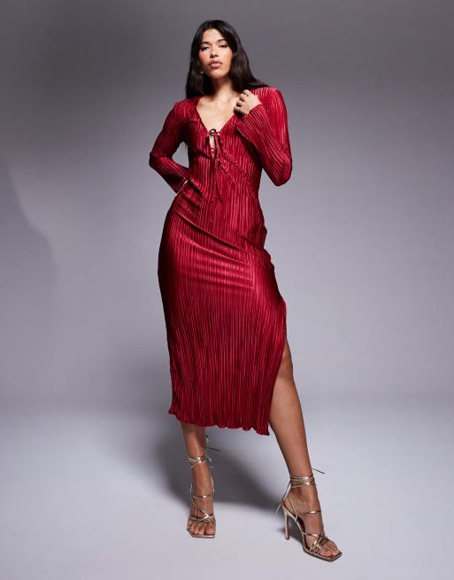 Esclusiva In The Style - Vestito lungo bordeaux plissé allacciato sul davanti