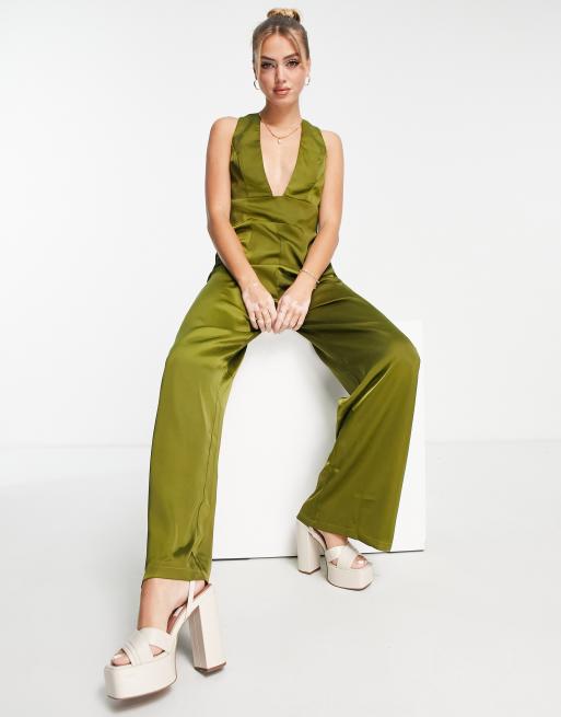 Esclusiva In The Style x Yasmin Devonport - Tuta jumpsuit lime a fondo ampio con scollo profondo sul davanti