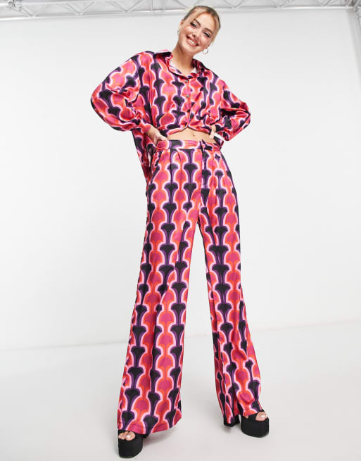 In The Style - Coordinato con pantaloni a zampa e camicia oversize rosa con stampa geometrica