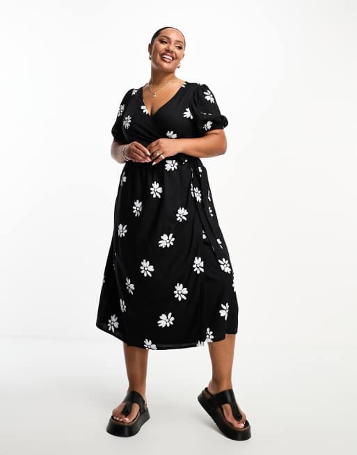 Influence Plus - Vestito midi a portafoglio nero a fiori bianchi
