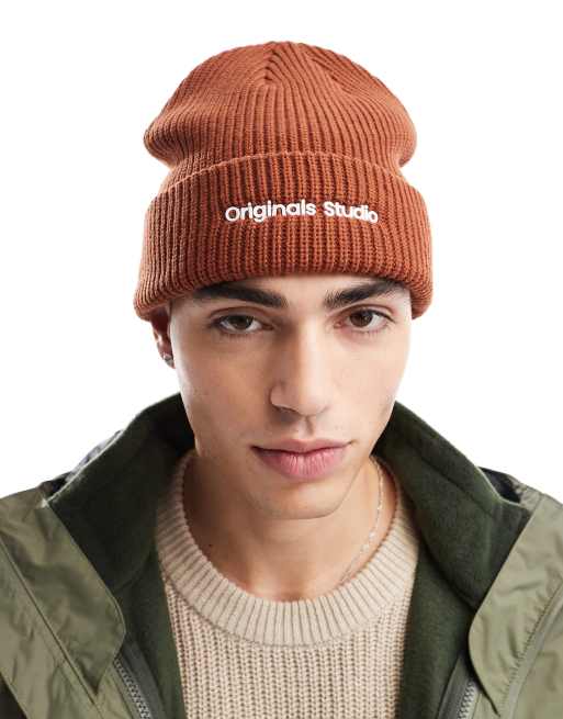 Jack & Jones - Berretto in maglia spessa arancione bruciato con logo Originals