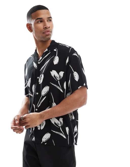 Jack & Jones - Camicia nera a maniche corte con stampa a fiori e rever