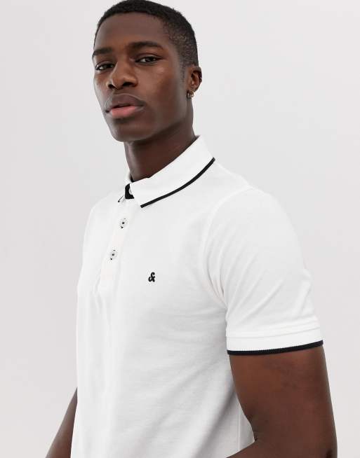 Jack & Jones Essentials - Polo slim bianca in piqué con bordi a contrasto e logo