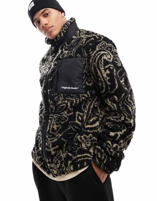 Jack & Jones - Giacca in pile borg nera con stampa cachemire e zip