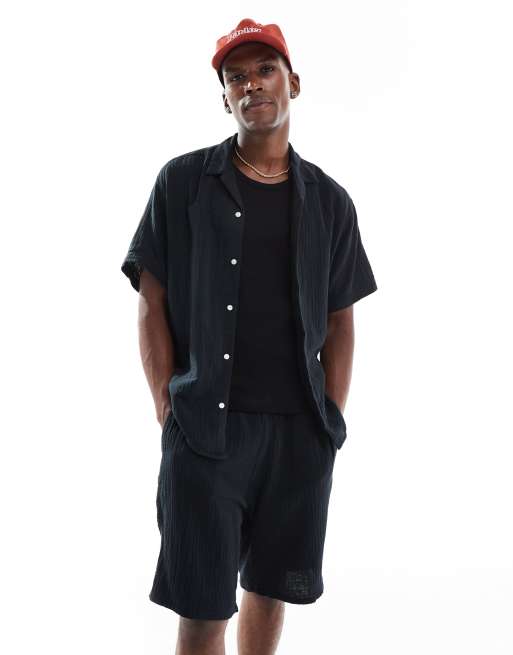 Jack & Jones - Set nero testurizzato con camicia con colletto a rever e pantaloncini