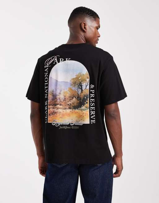 Jack & Jones - T-shirt oversize nera con paesaggio sul retro