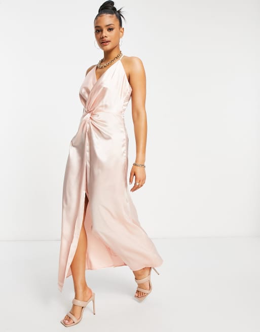 Jaded Rose - Vestito rosa con gonna al polpaccio di raso con sul incrocio davanti
