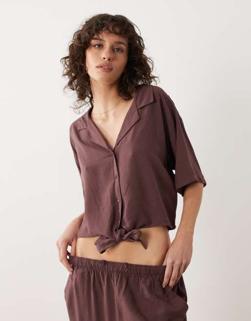 JDY - Camicia in misto lino bordeaux allacciata sul davanti in coordinato