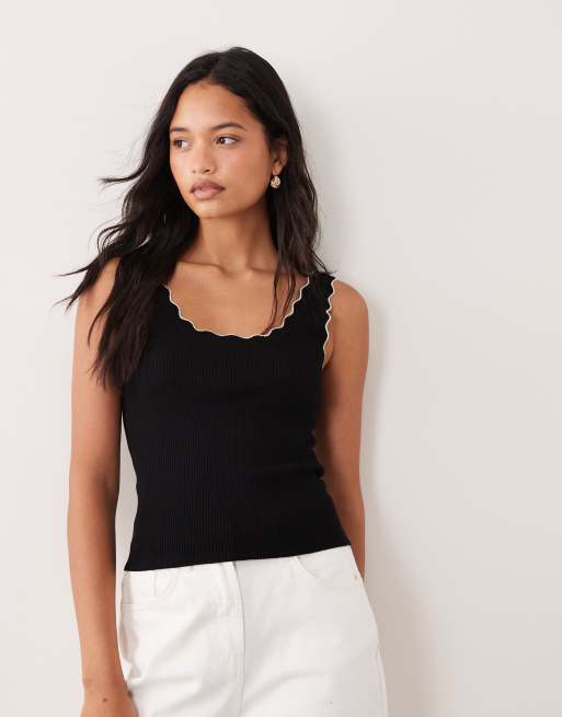 JDY - Canotta in maglia nera con bordi smerlati e cuciture bianche a contrasto