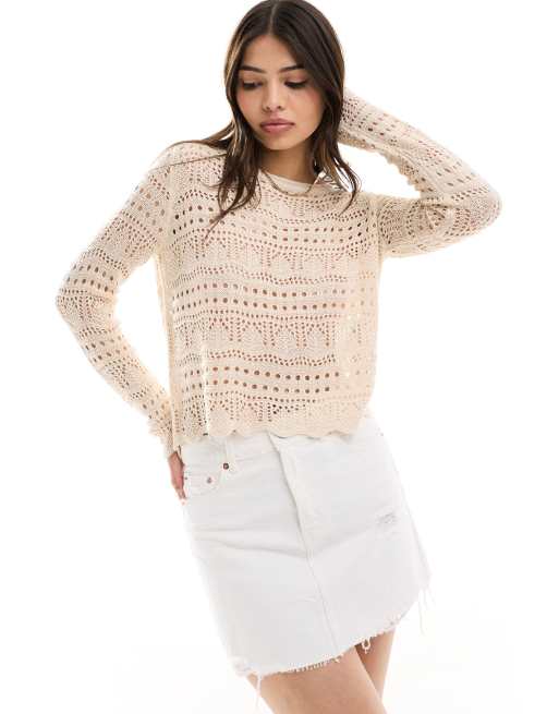 JDY - Top a maniche lunghe beige in pizzo sangallo con scollo a barchetta