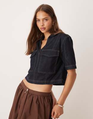 JDY - Top in denim squadrato blu scuro con scollo a V