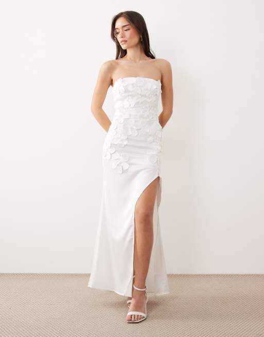 JW PEI - Vestito lungo bianco a fascia con spacco sulla coscia e volant con applicazioni floreali