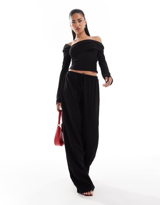 Esclusiva Kaiia - Coordinato nero a coste con top a maniche lunghe asimmetrico con spalle scoperte e pantaloni