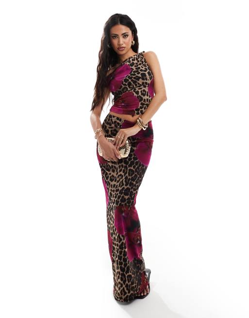 Esclusiva Kaiia - Coordinato rosa a fiori con stampa leopardata con top aderente con spalle scoperte e gonna lunga con strato sovrapposto in rete