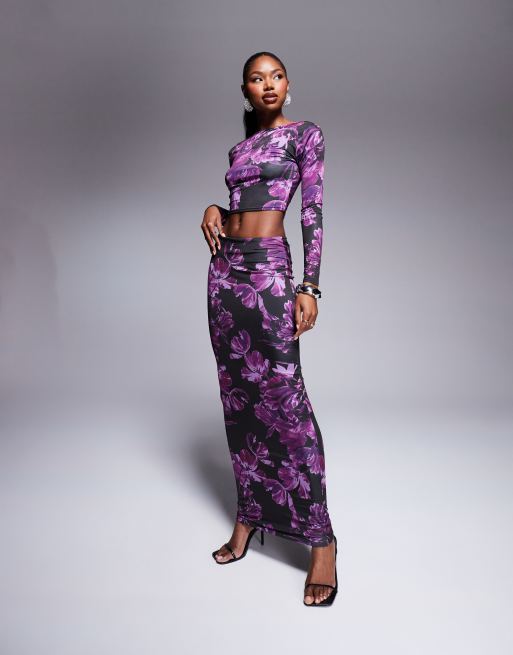 Esclusiva Kaiia - Coordinato viola con stampa con top a maniche lunghe aderente con scollo sul retro e gonna lunga