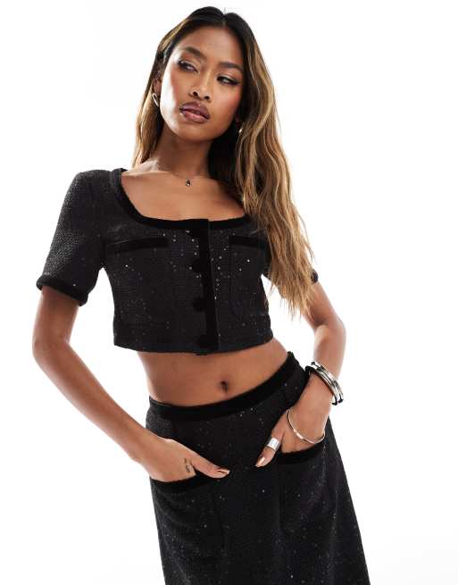 Esclusiva Kaiia - Crop top nero bouclé con bottoni e tasca in coordinato