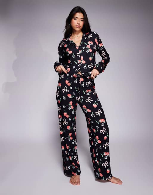 Esclusiva Kaiia - Mix and Match - Pantaloni del pigiama con stampa di fiocchi e fragole su sfondo scuro in coordinato