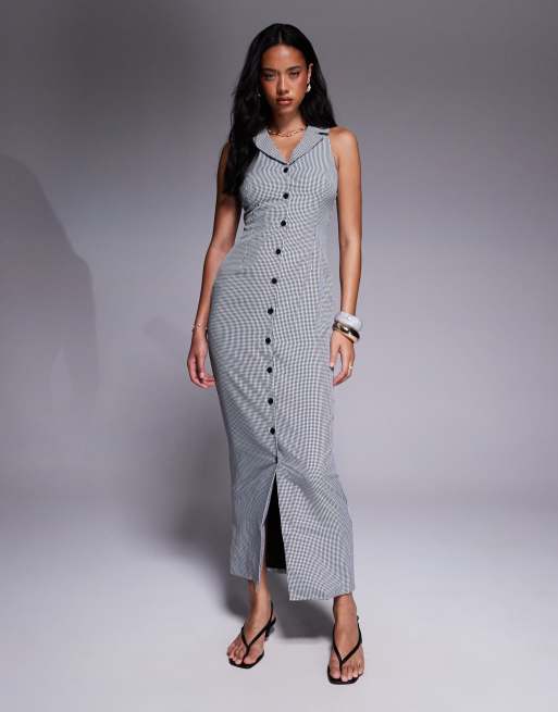 Esclusiva Kaiia - Vestito lungo allacciato al collo nero a quadretti con colletto e bottoni