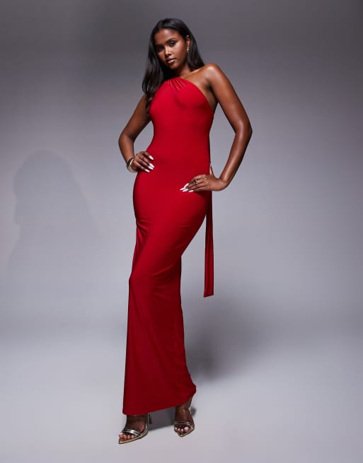 Esclusiva Kaiia - Vestito lungo monospalla sinuoso a doppio strato rosso con anello in metallo sul retro
