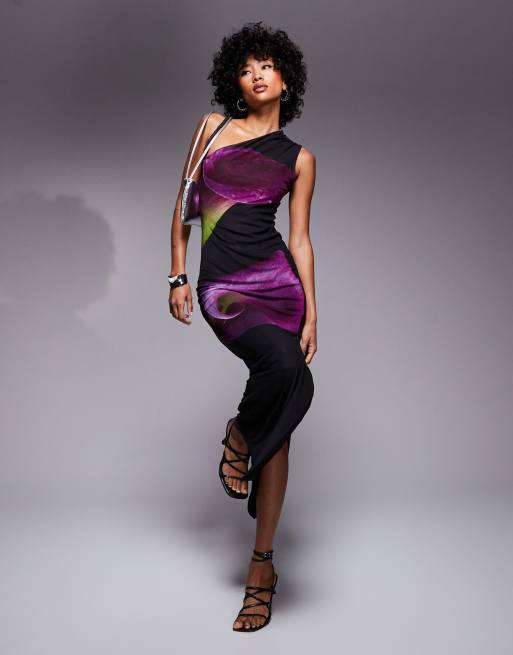 Esclusiva Kaiia - Vestito lungo nero e viola con stampa di gigli e spallina attorcigliata