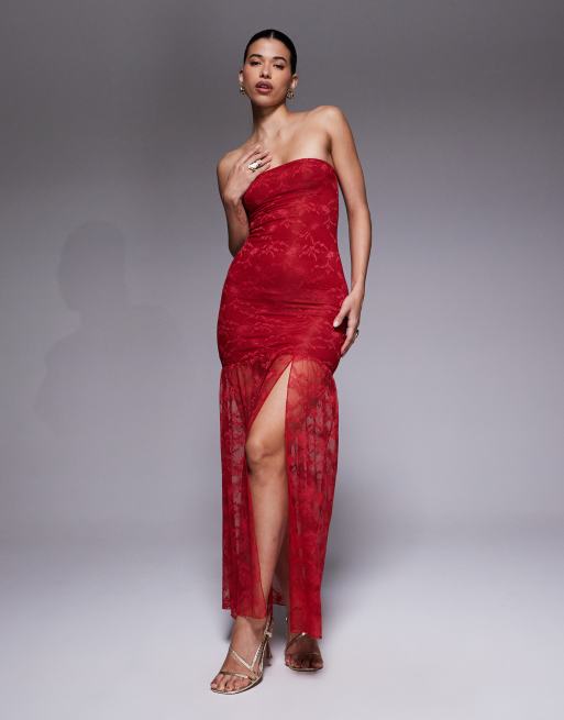 Esclusiva Kaiia - Vestito lungo sinuoso a doppio strato rosso in pizzo a fascia con fondo trasparente