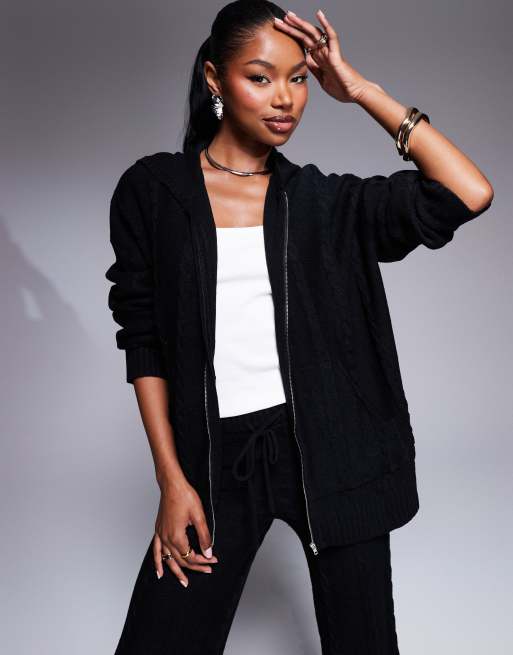 Kaiia - Coordinato nero in maglia a trecce con felpa con cappuccio con zip e pantaloni con fondo ampio
