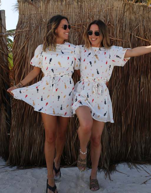 Labelrail x Collyer Twins - Vestito corto con maniche a sbuffo bianco con stampa di cavallucci marini e allacciatura in vita