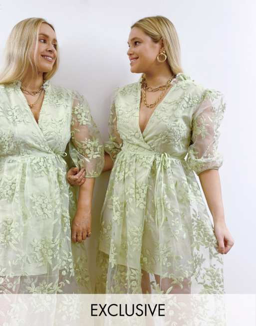 Labelrail X Olivia & Alice - Vestito con gonna al polpaccio verde con fiori ricamati