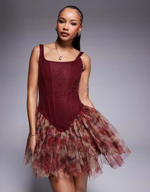 Lace & Beads Petite - Vestito corto stile corsetto bordeaux con stampa di rose e fondo allungato