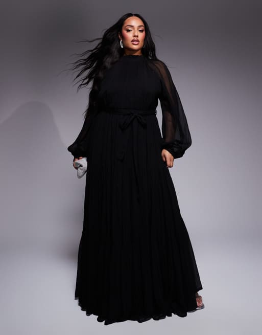 Lace & Beads Plus - Vestito lungo a balze nero con maniche a palloncino