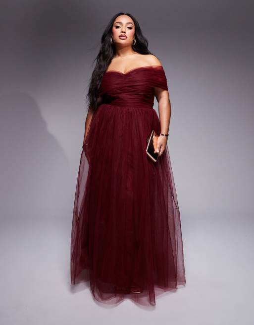 Lace & Beads Plus - Vestito lungo in tulle bordeaux con spalle scoperte e fiocco