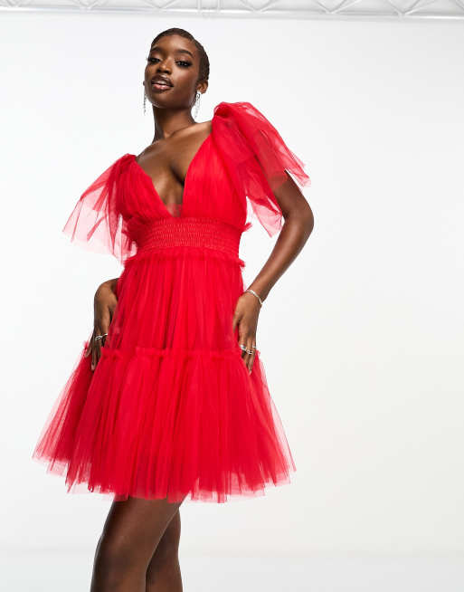 Lace and Beads - Vestito corto in tulle rosso con volant