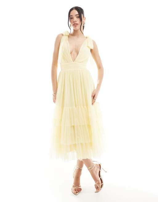 Lace & Beads - Madison - Vestito da damigella color giallo latticello con gonna al polpaccio e fiocchi sulle spalle
