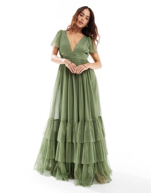 Lace & Beads - Madison - Vestito da damigella lungo in tulle oliva tenue con scollo a V