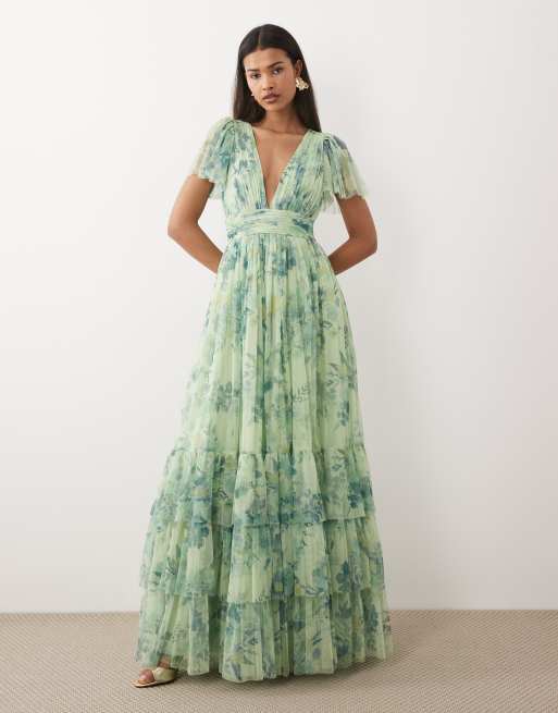 Lace & Beads - Vestito lungo con maniche con volant e stampa verde salvia