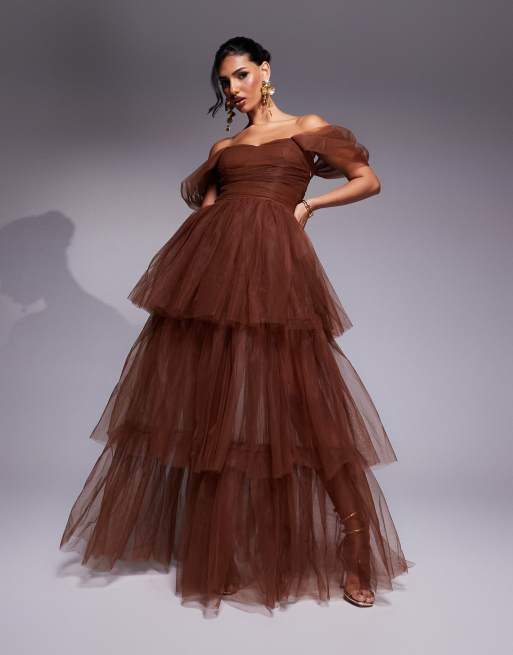 Lace & Beads - Vestito lungo in tulle con spalle scoperte e fondo asimmetrico marrone