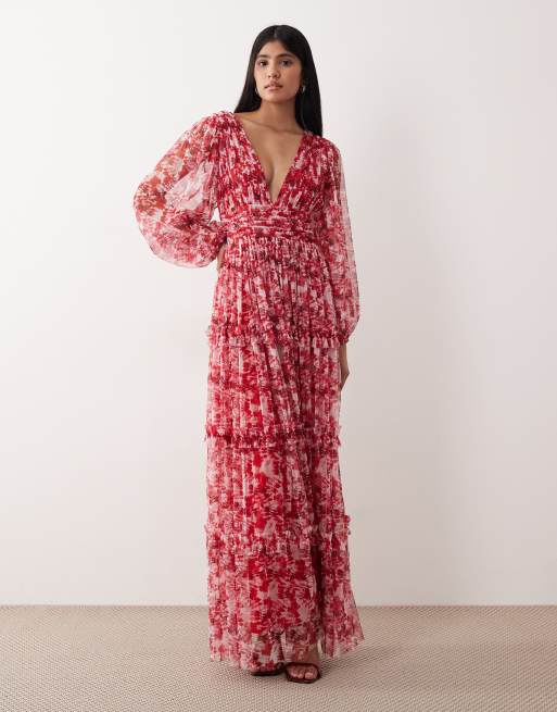 Lace & Beads - Vestito lungo rosa e rosso a fiori con maniche a campana trasparenti e scollo a V profondo