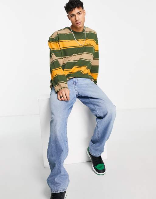 Levi's - Maglietta a maniche lunghe verde e giallo rigato con logo piccolo