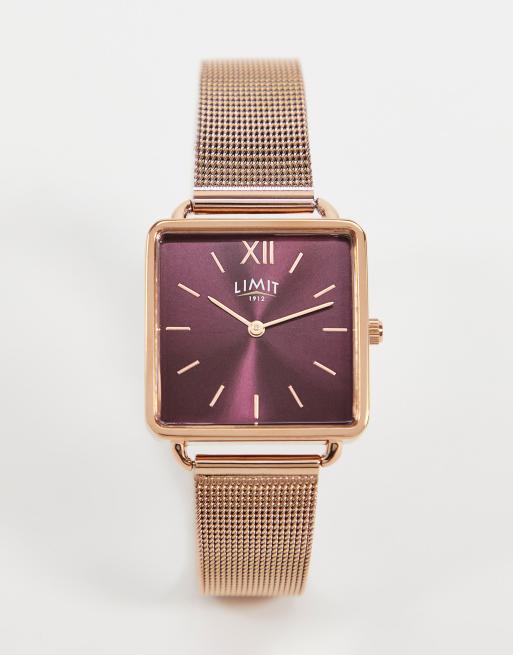 Limit - Orologio quadrato in maglia metallica oro rosa con quadrante rosso