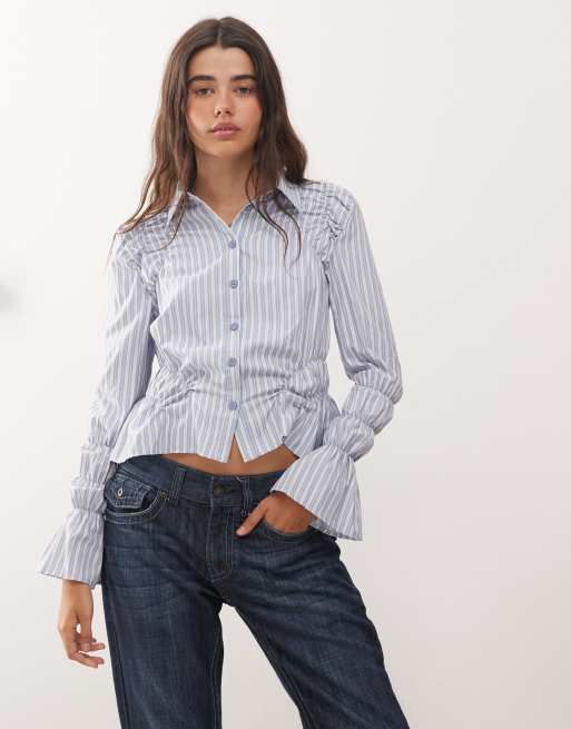 Lioness - Manor - Camicia corta blu a righe con maniche arricciate e bottoni