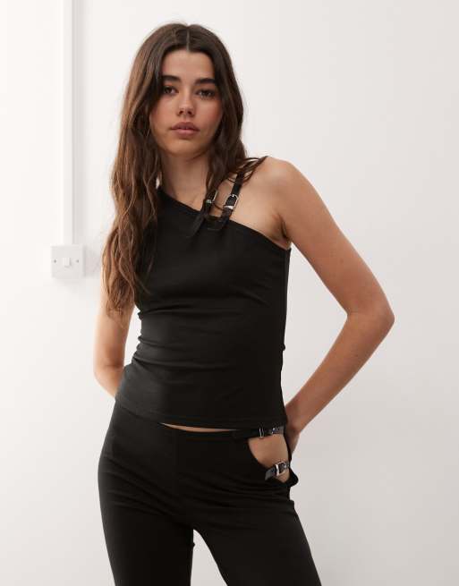 Lioness - Rebel - Top senza maniche nero con spalline asimmetriche e fibbie in coordinato