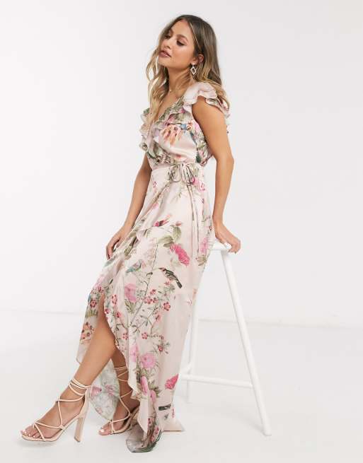 Lipsy x Abbey Clancy - Vestito midi a portafoglio rosa a fiori con volant