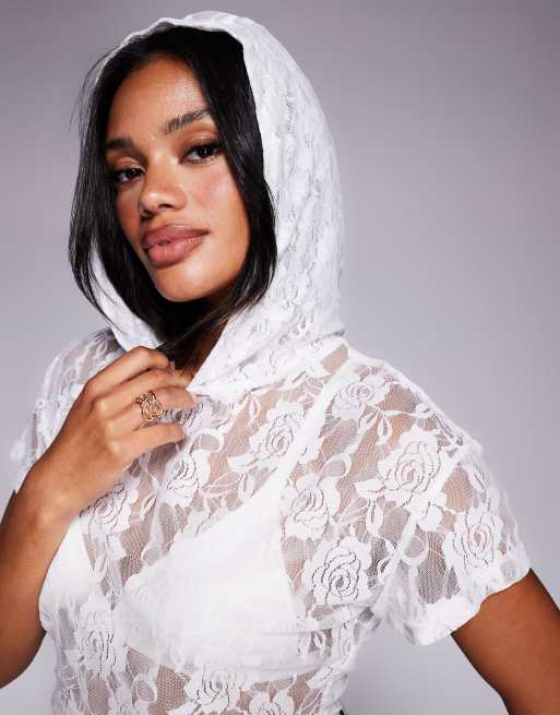 Liquor N Poker - Felpa con cappuccio senza maniche bianca in pizzo