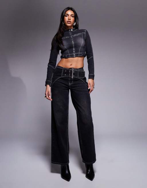 Liquor N Poker - Jeans ampi nero slavato con cuciture a contrasto e fibbia
