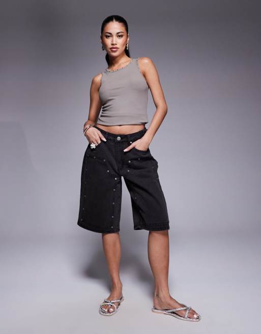 Liquor N Poker - Jorts multitasche in denim a vita medio alta nero lavaggio sporco