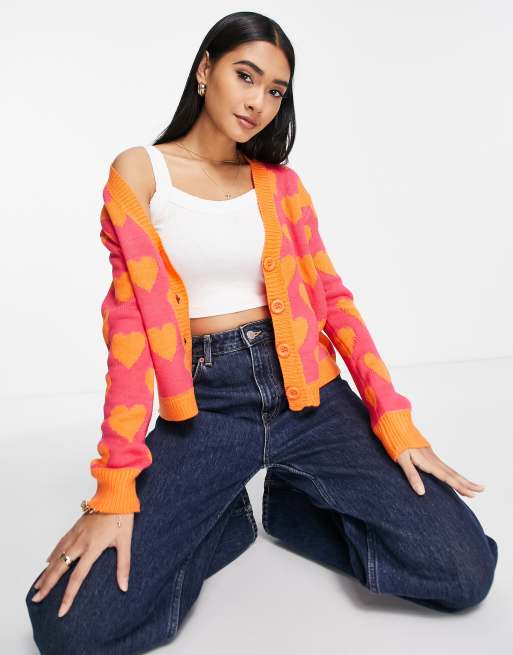 Liquorish - Cardigan fucsia e arancione con stampa a cuori e bottoni sul davanti
