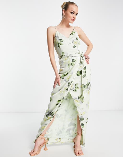 Liquorish - Vestito lungo avvolgente in raso verde tenue a fiori con cintura